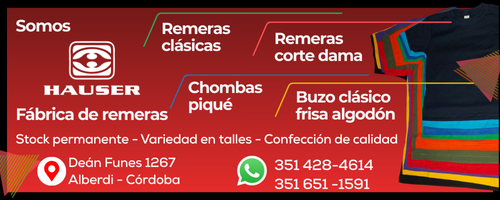 Somos una empresa ubicada en la ciudad de Córdoba (Argentina) dedicada a la fabricación de REMERAS CLÁSICAS jersey algodón, CHOMBAS piqué y BUZOS CLÁSICOS frisa algodón satisfaciendo las necesidades de grandes firmas y pequeños emprendedores. REMERAS CLASICAS en 4 calidades de jersey algodón cardado y Jersey algodón peinado. REMERA corte dama mangas cortas en 20/1 peinado. CHOMBAS piqué varios colores. BUZOS frisa algodón con cuello, cintura y puño varios colores. TALLES REALES.